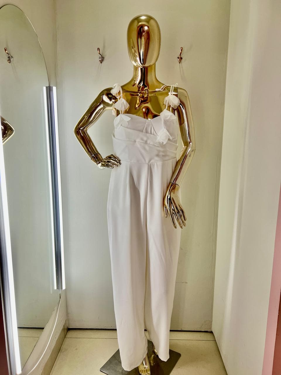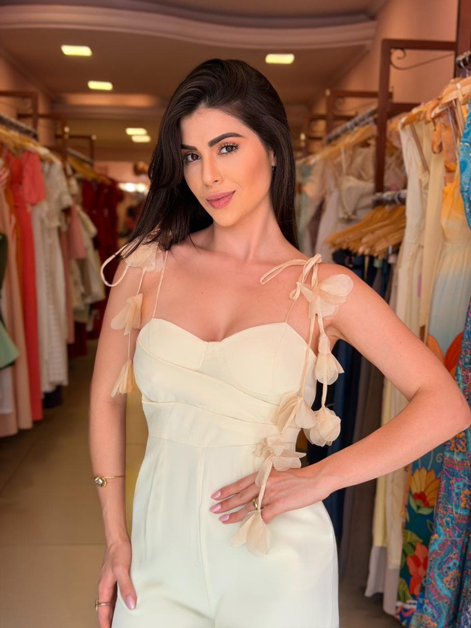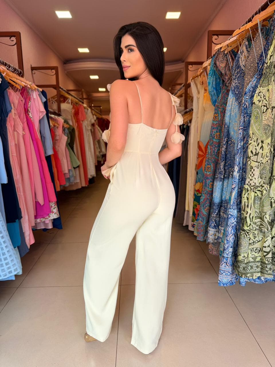 Macacão com modelagem elegante e sofisticada. Possui decote coração que valoriza o colo e alças finas delicadas adornadas com aplicações florais em tecido, trazendo um toque romântico e exclusivo à peça. A cintura é levemente marcada, garantindo um caimento impecável, enquanto a calça de corte reto alonga a silhueta e proporciona conforto.