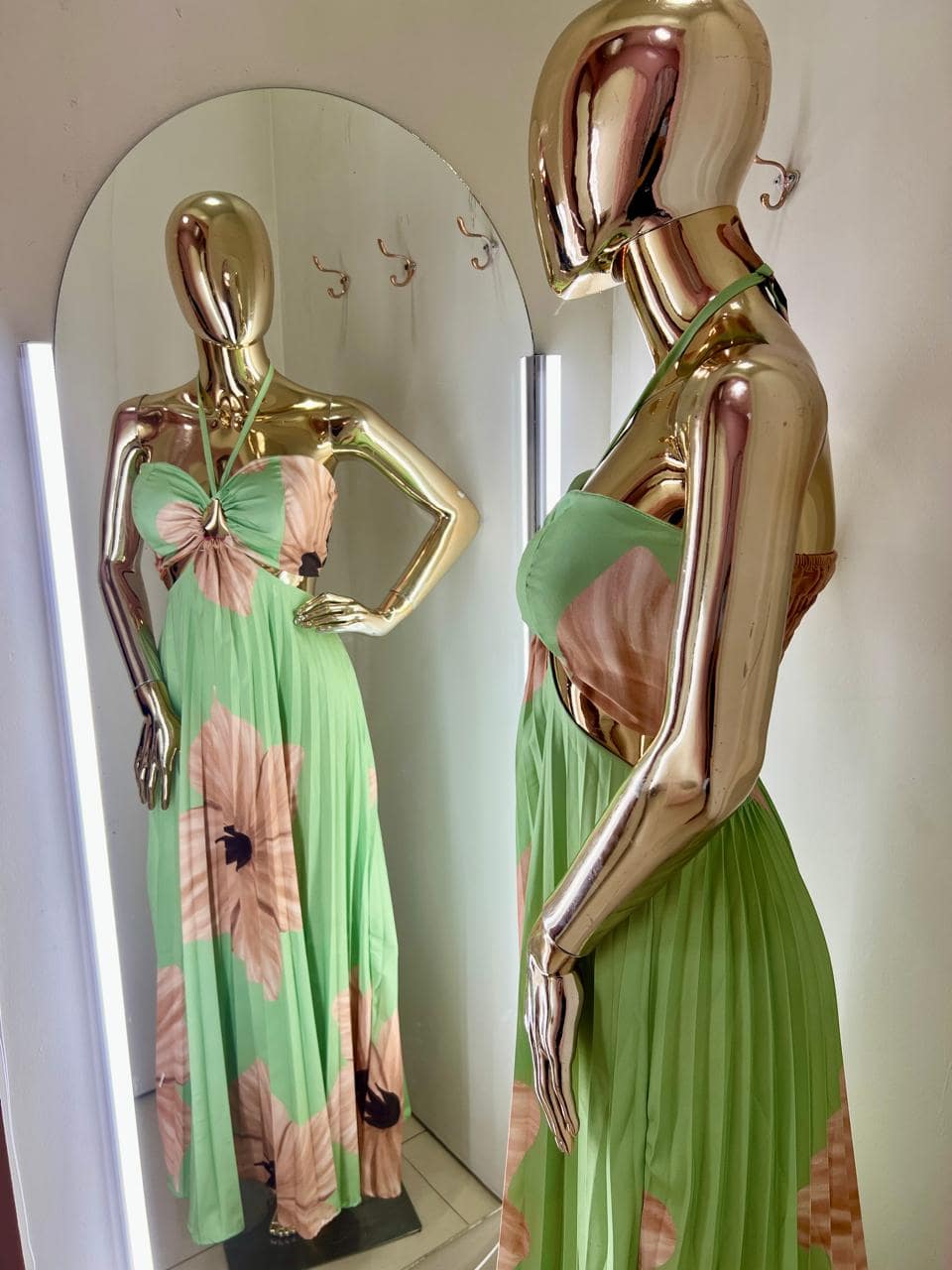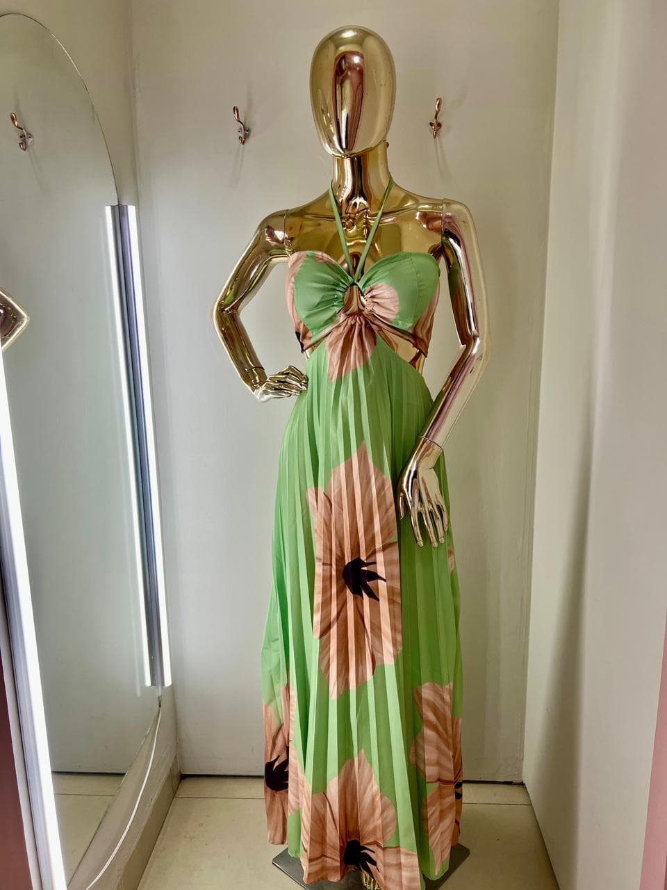 Vestido longo com estampa floral delicada em tons suaves. Possui decote central, recortes estratégicos e saia plissada que traz leveza e movimento. Um modelo elegante, feminino e ideal para ocasiões especiais ou produções cheias de charme.